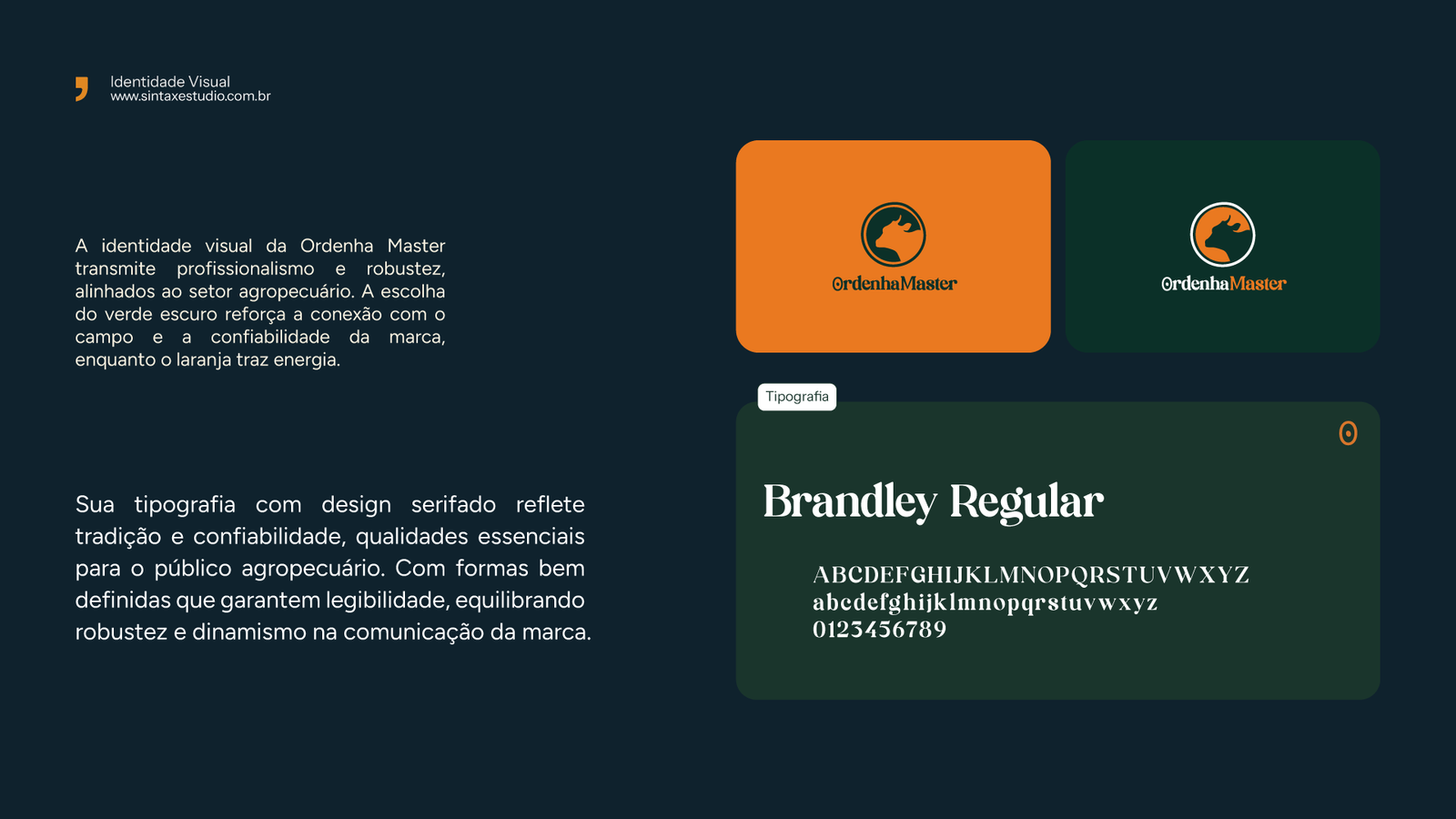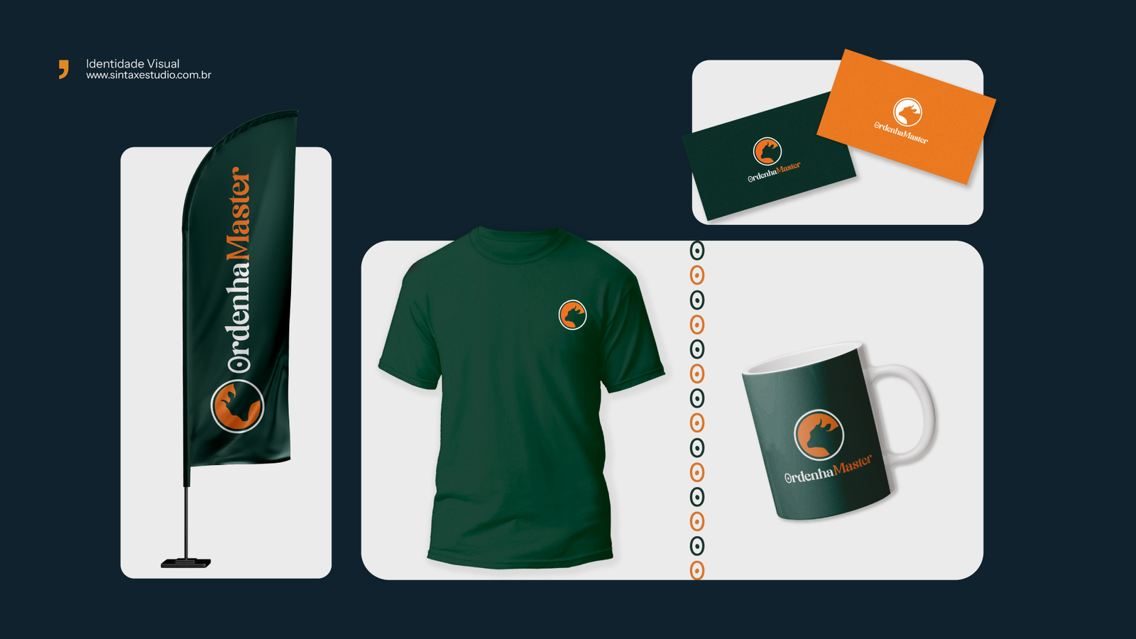 A identidade visual da Ordenha Master transmite robustez. A escolha do verde escuro reforça a conexão com o campo e a confiabilidade da marca, enquanto o laranja traz energia e dinamismo.
